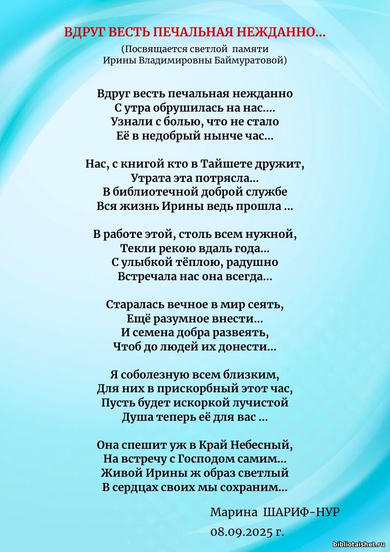 Ирина Владимировна внесла неоценимый вклад в развитие литературного творчества местных авторов, являясь руководителем объединения «Тайшет литературный». Она была настоящим книголюбом и щедро делилась своей любовью к литературе, всегда находила нужные слова и рекомендовала книги своим читателям. В память об Ирине Владимировне одна из участниц литературного объединения Муслима Валеева (Марина ШАРИФ - НУР) посвятила ей трогательные строки «Вдруг весть печальная нежданно…» | |